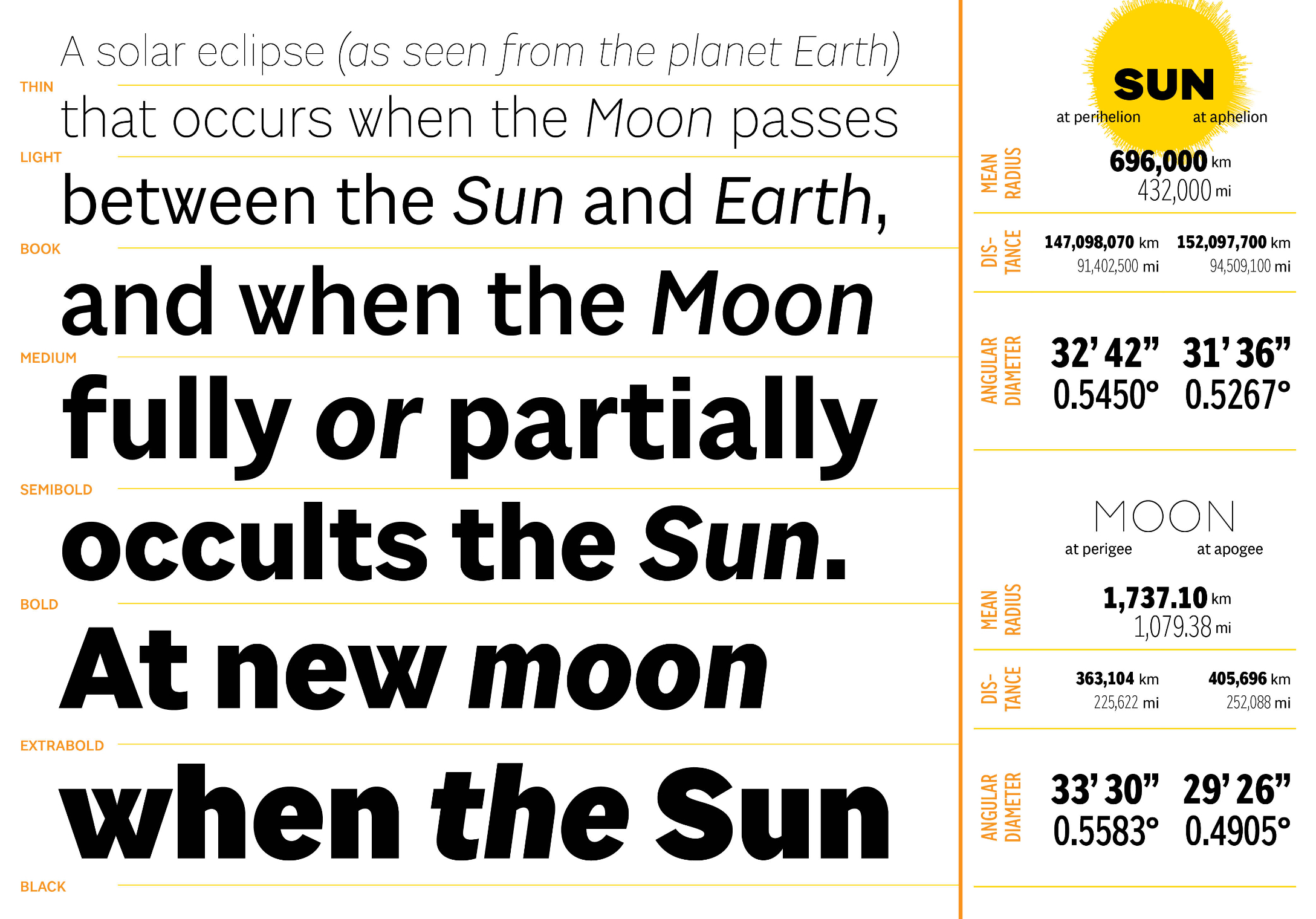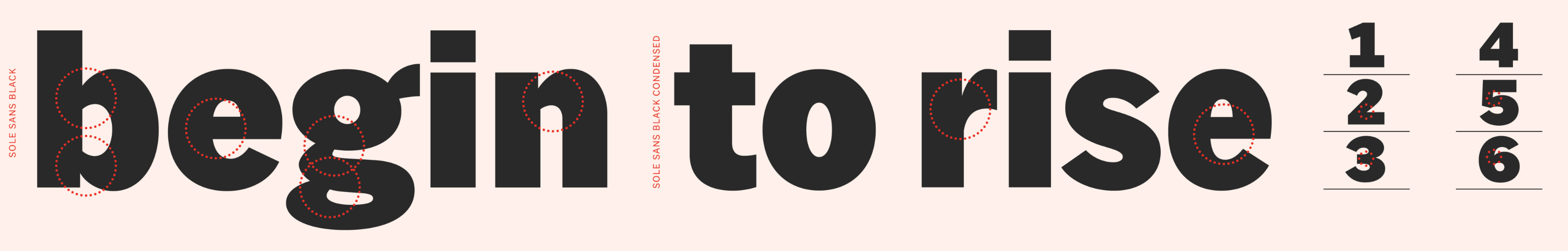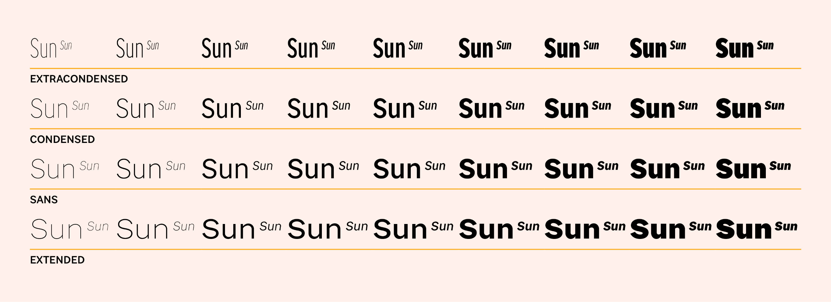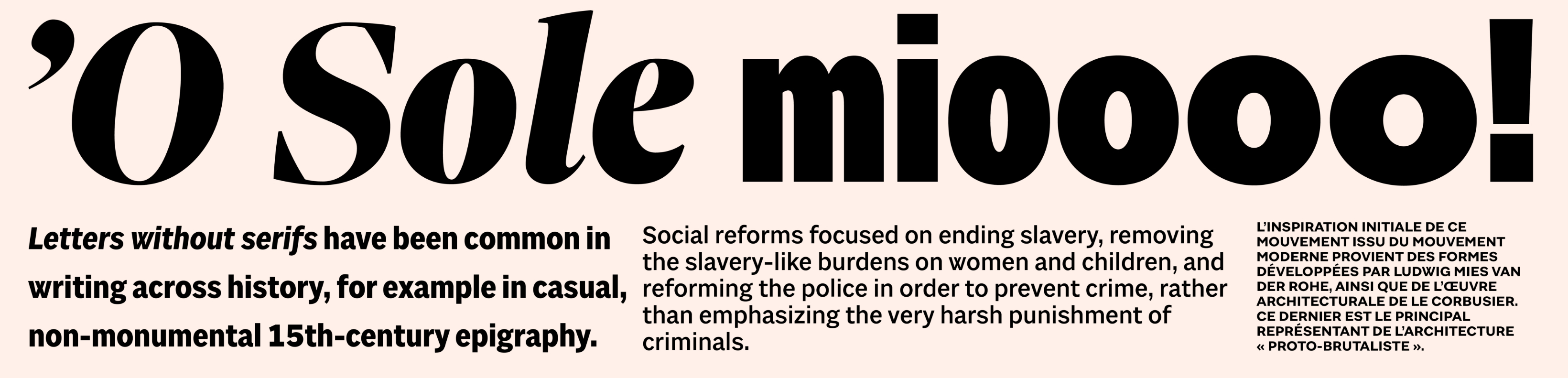 LP — We thought this stylistic choice matched the design of Sole Serif, even though the two types are very different from the formal standpoint: where Serif has a an inclined axis, Sans has a vertical one, where Serif has wide apertures, in Sans these are reduced etc. As in Sole Serif, we have tried to maintain a formal coherence and to introduce a series of variables that satisfy precise functional criteria: big counters and tapering of shoulders as they meet stems.