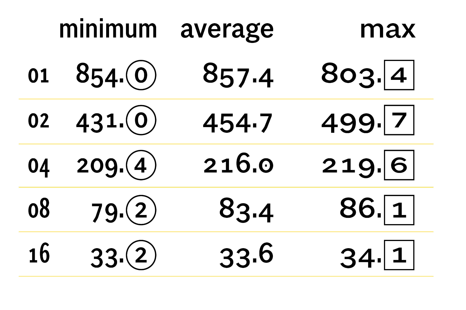 LP — In general we avoided designing types that are too regular, so as not to create patterns that are themselves too regular. The reason behind this – as suggested by the works of Ann Treisman and Arnold J. Wilkins, especially for numbers – is that typefaces can make very regular patterns of vertical and horizontal lines that interfere with reading. In fact, according to research by Wilkins, the oxygen consumption of some areas of the brain during the observation of a regular pattern is much greater than normal; furthermore Treisman has highlighted how irregularities in an irregular pattern are less noticeable than in a regular pattern.