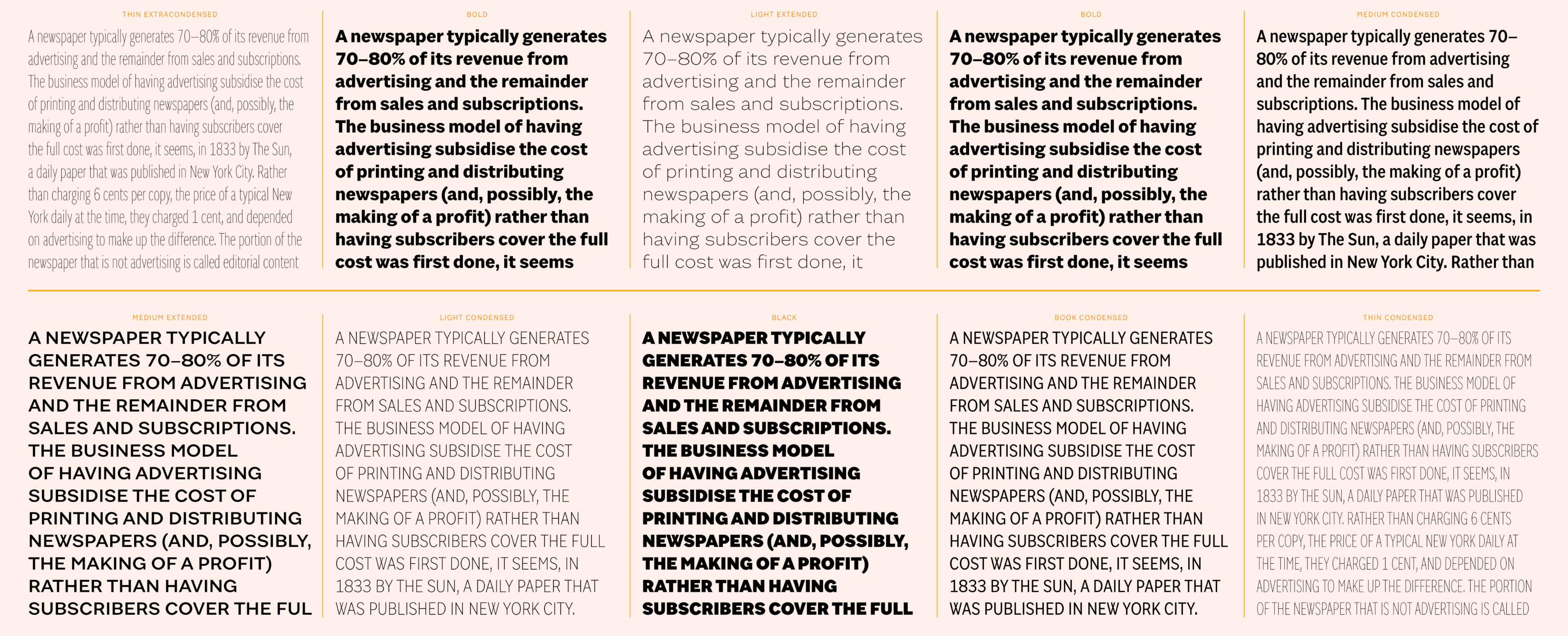 RO— The client asked for a compressed version for tables, lists and so on. At the explicit request of the design team we pushed ourselves to create an extreme, almost excessively compressed version which in some weights is 40% less than the regular. In this kind of family (sans with condensed versions), usually the condensed/compressed versions are used for headlines, or in any case for large text, but in our case the compressed form was for small text, usually smaller than the text set with the regular type. This forced us to make some design decisions that might seem bizarre at first glance, and which we decided to emphasise. For instance, contrary to the norm for typefaces of this kind, we widened the apertures of the compressed version of a, c, e etc. much more than in the standard version.